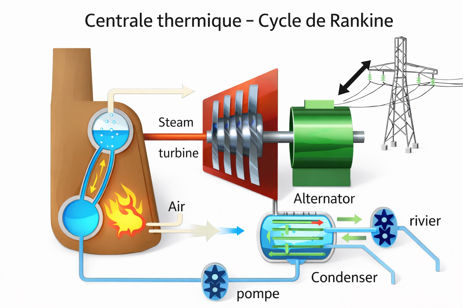 Le premier chapitre est consacré aux machines thermiques. Il présente le cycle de Carnot, le rendement thermique, ainsi que l’étude des principales machines : moteurs à combustion interne, turbines à gaz et machines à vapeur. Ce dernier volet inclut les cycles Rankine, Hirn, les cycles à resurchauffe et à soutirage, avec leur représentation dans les différents diagrammes thermodynamiques : (T, S), (P, V) et (H, S). Le deuxième chapitre porte sur les pompes et compresseurs. Il aborde les courbes caractéristiques, la hauteur manométrique, le NPSH disponible et requis, ainsi que le rendement des machines. Le troisième chapitre traite de la production du froid. Il comprend l’étude thermodynamique du cycle de Carnot inversé, l’analyse des cycles frigorifiques réels, ainsi qu’une introduction aux pompes à chaleur.