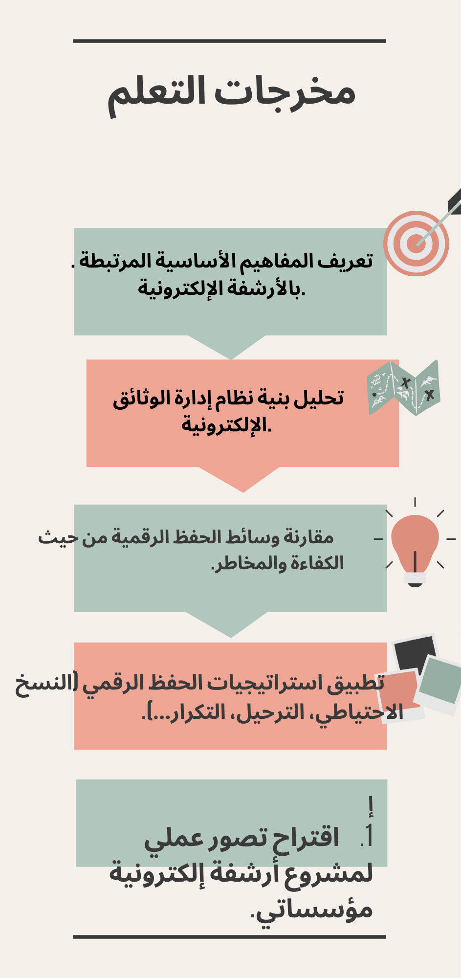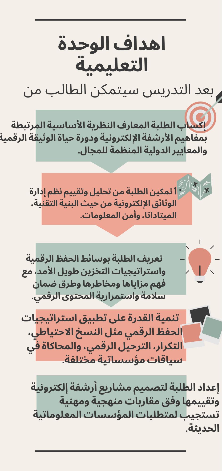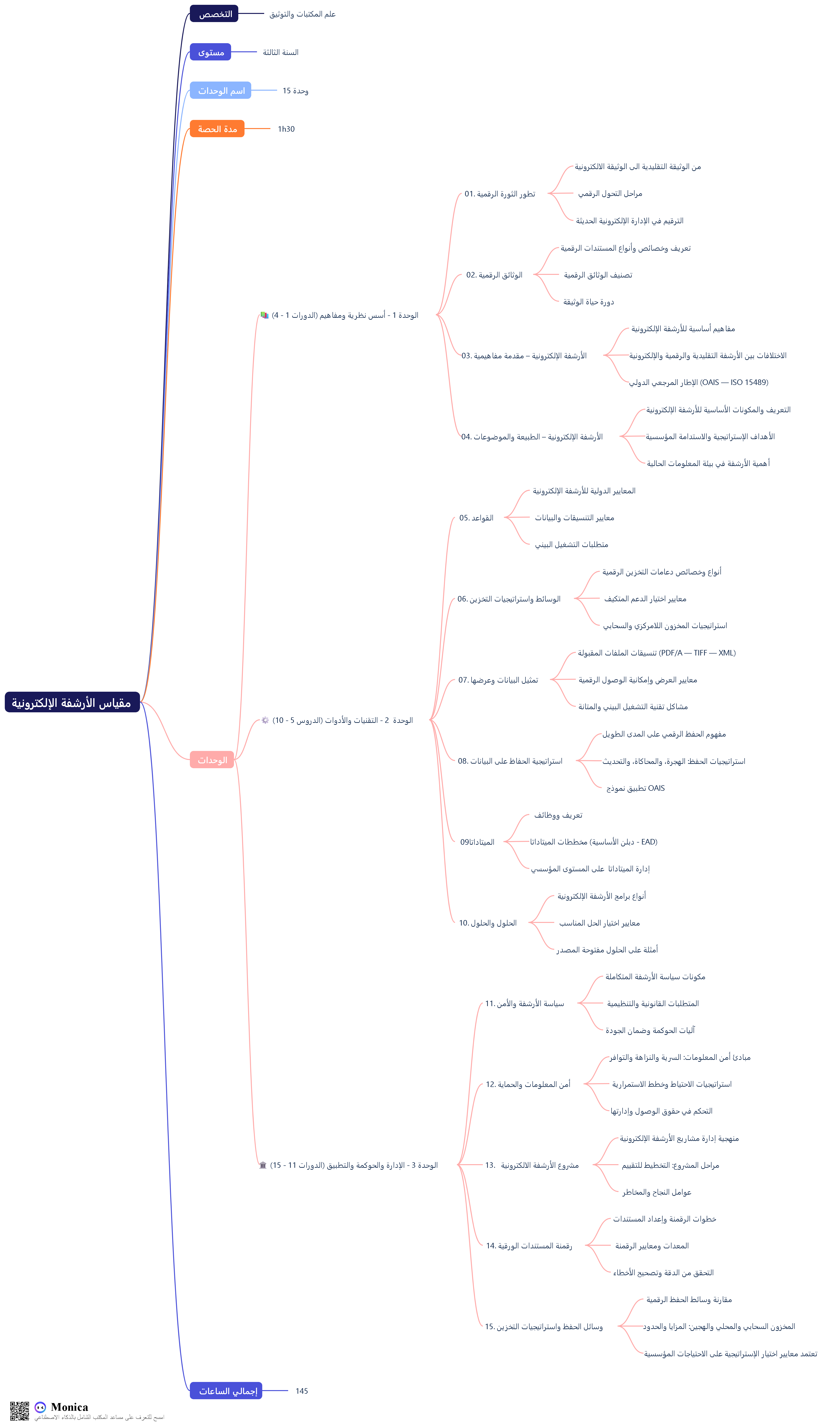 تتناول هذه الوحدة التعليمية مضمون الأرشفة الإلكترونية من خلال دراسة مفاهيمها الأساسية، ودورة حياة الوثيقة الرقمية، والمعايير الدولية المؤطرة لإدارة الوثائق الإلكترونية. كما تعالج وسائط الحفظ الرقمي واستراتيجيات التخزين والحفظ طويل الأمد، إضافة إلى قضايا أمن المعلومات وضمان سلامة البيانات. ويُختتم المقرر بمحور تطبيقي يركز على تخطيط وتصميم وتقييم نظم الأرشفة الإلكترونية في المؤسسات المعلوماتية.