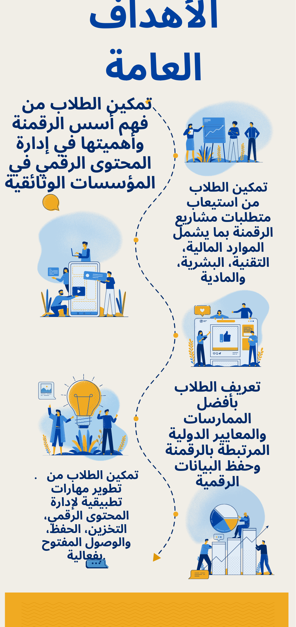 يهدف مقياس تطبيقات الرقمنة إلى تمكين الطلبة من فهم الأسس النظرية والتطبيقية لتحويل الأرصدة الوثائقية من الشكل التقليدي إلى الشكل الرقمي، مع الإحاطة بالجوانب التقنية والتنظيمية والقانونية المرتبطة بذلك. ويتناول المقياس ضبط المفاهيم الأساسية (الأتمتة، الحوسبة، الرقمنة)، وأهداف مشاريع الرقمنة ومراحلها، إضافة إلى المعايير المعتمدة، ومتطلبات التنفيذ، وقضايا الحفظ والإتاحة وأمن المجموعات الرقمية، بما يضمن بناء كفاءات قادرة على تخطيط وتنفيذ مشاريع رقمنة وفق مقاربات علمية ومعايير مهنية.