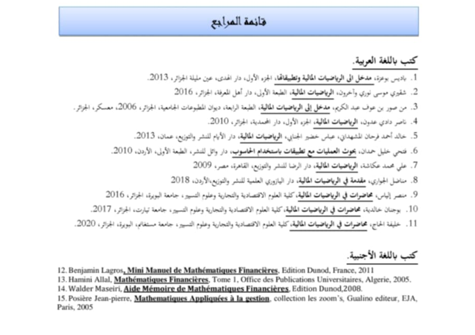يسعى مقياس الرياضيات المالية إلى تحقيق أهداف تعليمية من خلال مضمون نستعرضه لاحقا. وهو عبارة عن مجموعة دروس وتمارين موجهة لطلبة السنة الثانية علوم التسيير و المحضرة وفقا للبرنامج الوزاري.