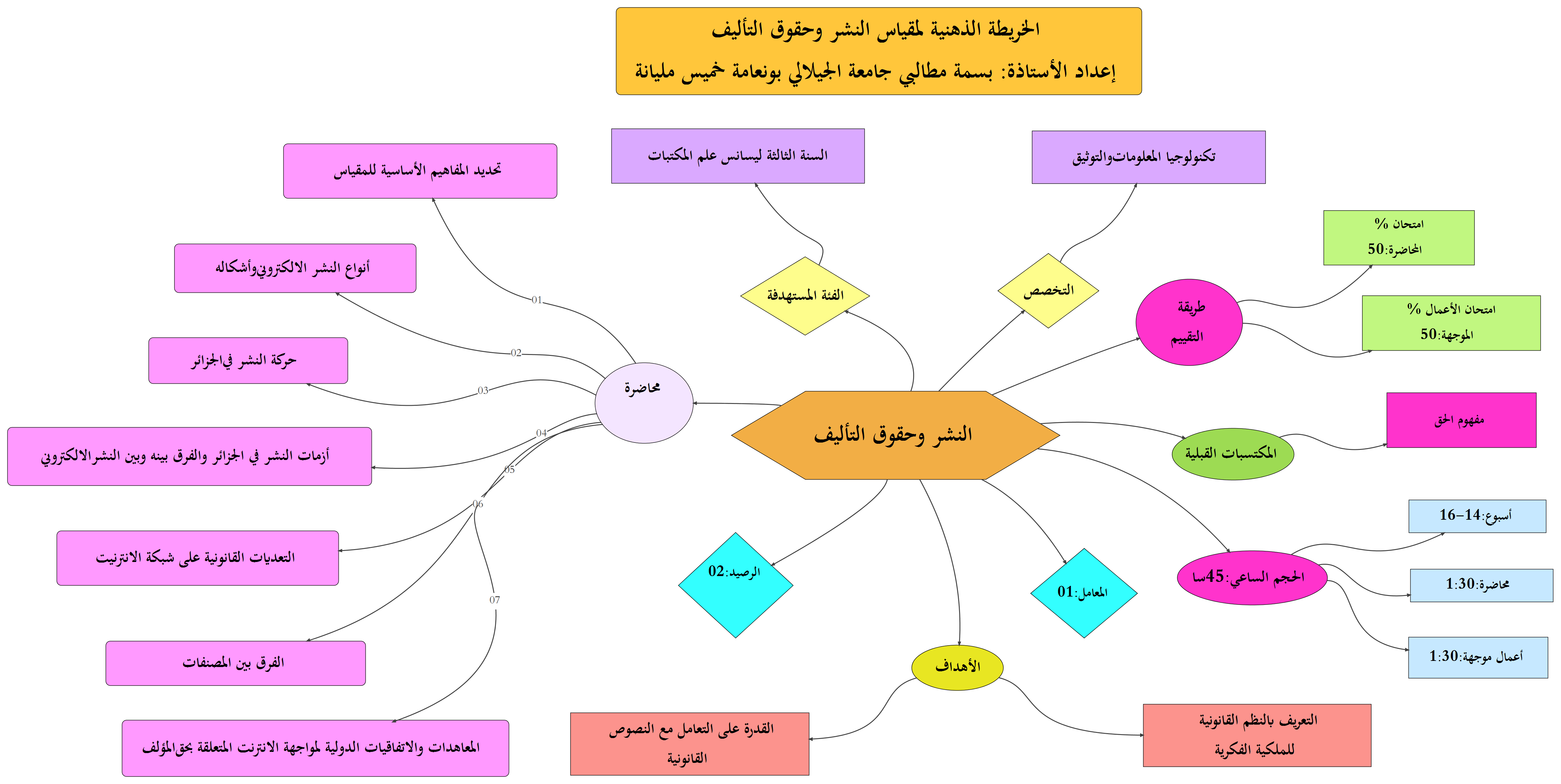 النشر وحقوق التأليف هو مقياس موجه لطلبة السنة الثالثة ليسانس علم المكتبات والمعلومات، تخصص تكنولوجيا المعلومات والتوثيق، يندرج ضمن وحدات التعليم الإستكشافية السداسية، من خلاله يتم تمكين الطلبة من الاطلاع على المفهوم القانوني الذي ينظم الحقوق المتعلقة بالمصنف الإبداعي ومجموعة الامتيازات الحصرية المتاحة لشخص طبيعي أو اعتباري على المصنف الفكري.