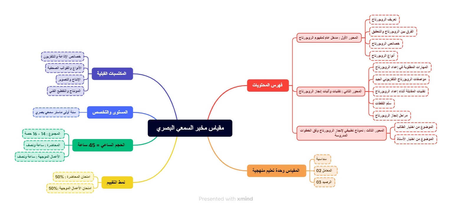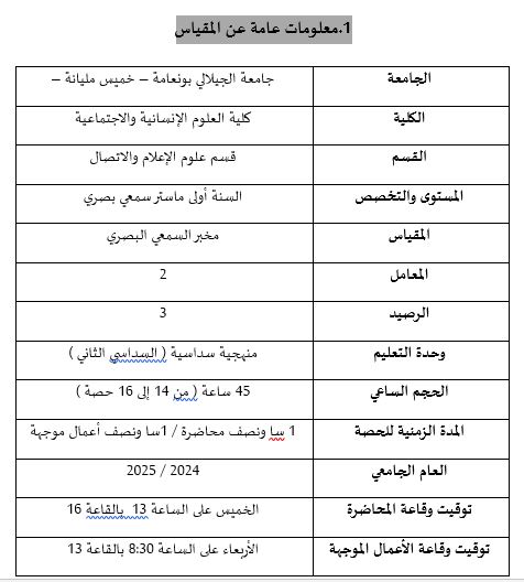 مقياس مخبر السمعي البصري هو وحدة تعليم منهجية سداسية بمعامل 02 ورصيد مقدر بـ 03 ، موجه أساسا إلى طلبة السنة الأولى ماستر سمعي بصري ، وهذا المقياس هو بمثابة دليل عملي ومنهجي يساعد الطالب على أخذ فكرة شاملة عن مختلف الأنواع الصحفية في الإذاعة والتلفزيون ، وقد ركز القائمون على تصميم برنامج المقياس على الروبورتاج الإذاعي والتلفزيوني باعتباره من أكثر المواد والمضامين الصحفية إنتاجا وتوظيفا في الإذاعة والتلفزيون ، إلى جانب أنه يتقاطع كثيرا مع كل الأنواع الصحفية الأخرى كالخبر والبورتريه والتحقيق والفيلم الوثائقي ، كما أن الروبورتاج أو التقرير يثير الكثير من التساؤلات لدى طلبة السمعي البصري بسبب صعوبة التفريق بينه وبين تلك الأنواع الصحفية ، لهذا تم الاهتمام بالروبورتاج في محاور هذا المقياس الذي سيمكن الطلبة من التحكم في أبجديات كتابة وتحرير وإنتاج الروبورتاج الإذاعي والتلفزيوني والتفريق بينه وبين الأنواع الصحفية الأخرى