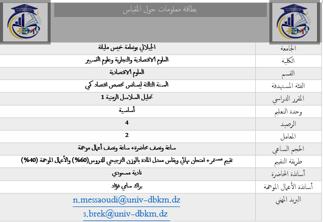 - استيعاب المفاهيم المتعلقة بالسلسلة الزمنية وطرق تقدير مركباتها والكشف عنها.