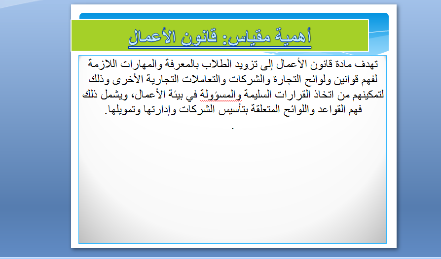 الأهداف التعليمية: إكتساب الطالب القدرة على فهم وتحليل أهم القوانين الخاصة بالتجارة