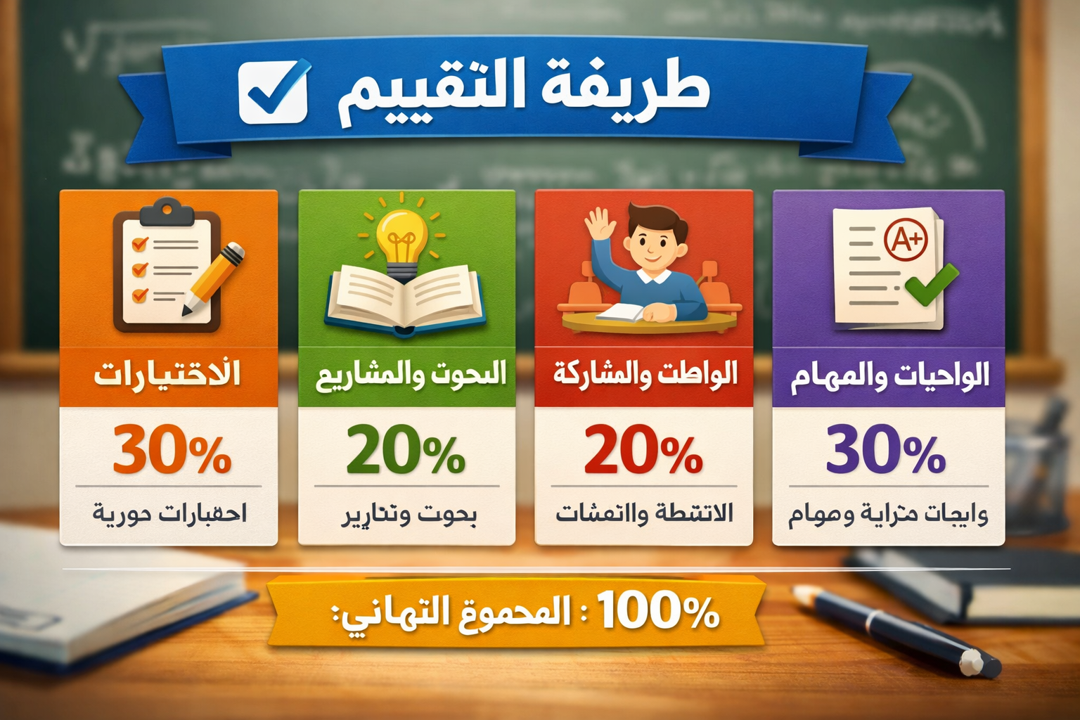 1. تقويم كتابي في نهاية السداسي ،يضم كل ما تم التطرق إليه ومناقشته وشرحه أثناء تقديم المحاضرات إضافة إلى الموارد والمراجع التي طلب منكم الاطلاع عليها ،والتي تمت مناقشتها ،ويتضمن التقويم أسئلة التحليل واستنباط درجة الفهم للطالب والعلامة تكون 65% من المعدل العام
